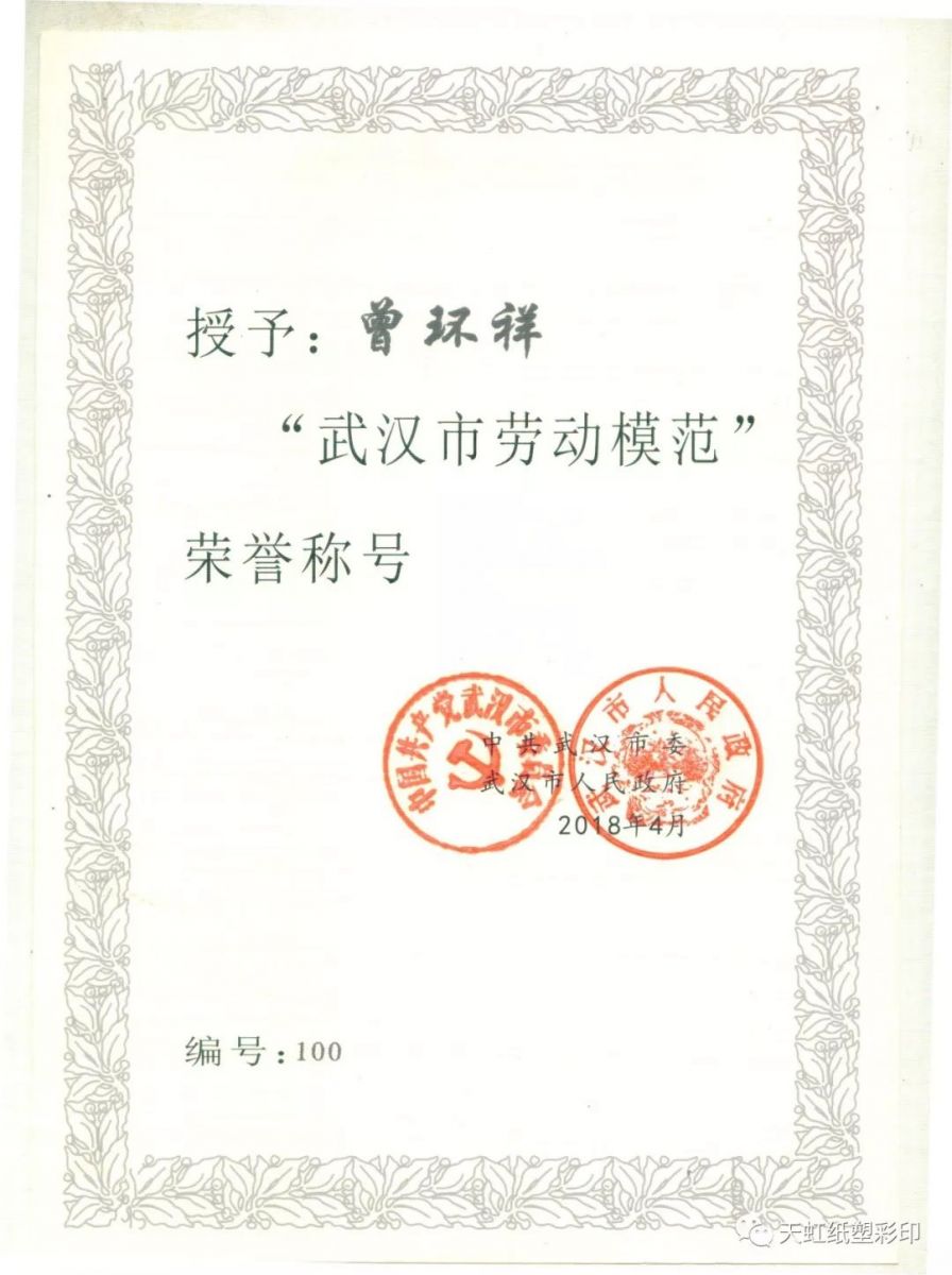 近年來,武漢市天虹紙塑彩印有限公司大力弘揚勞模精神,先后有6名員工分別榮獲武漢市“勞動模范”和”五一勞動獎?wù)?ldquo;,在推動武漢市精神文明建設(shè)和促進(jìn)公司發(fā)展發(fā)揮了積極作用。