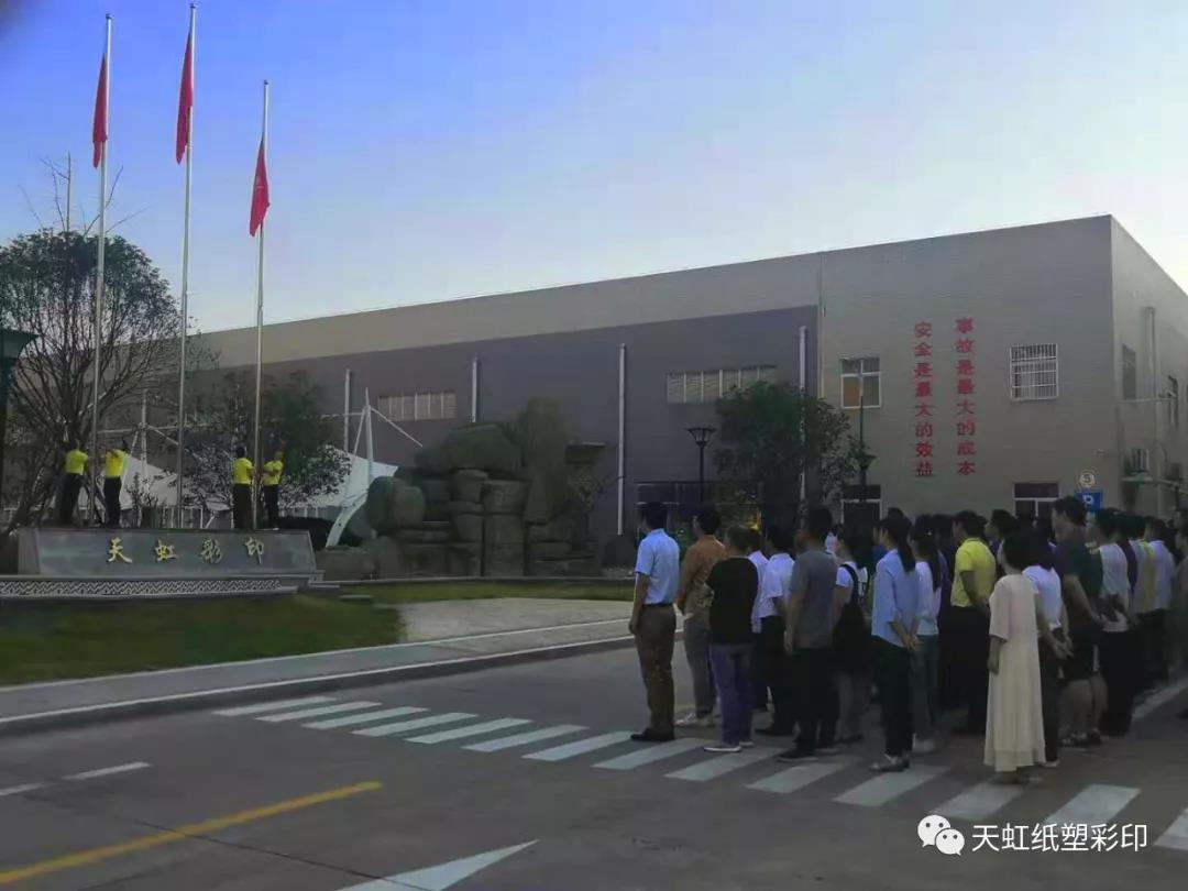 金秋十月,普天同慶。9月30日,在國慶節到來之際,武漢市天虹紙塑彩印有限公司隆重舉行升旗儀式,慶祝新中國成立70周年。上午7時30分,伴隨著莊嚴的國歌聲,鮮艷的五星紅旗冉冉升起,迎風飄揚。天虹員工精神抖擻,莊嚴肅立,面向國旗行注目禮,向偉大祖國致以崇高敬意和美好祝福,公司員工代表110人參加了升旗儀式。